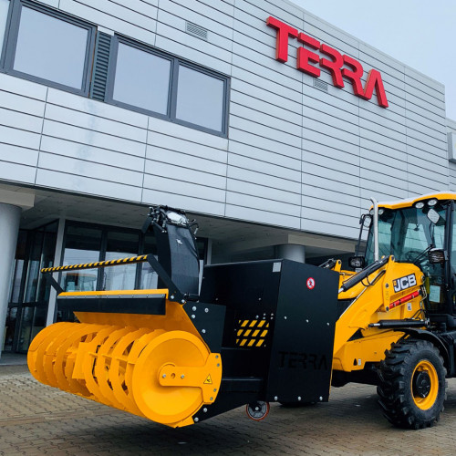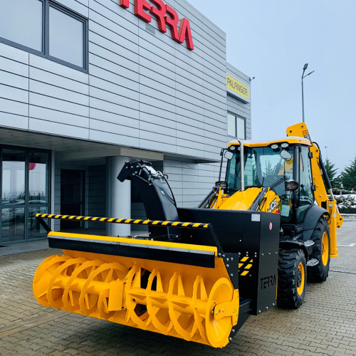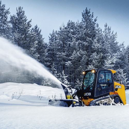 Snežna freza JCB lahko s svojimi dvofaznimi hidravličnimi ventilatorji odmetava sneg do 1,4 m daleč.